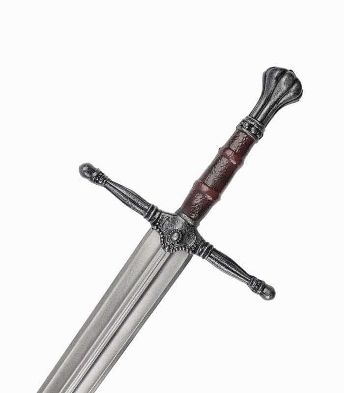 The detailed craftsmanship brings this medieval weapon to life — from the fluted cruciform crossguard with ball-point ends and layered bands to the ornate chappe featuring a studded faux jewel. The steely grey lobed pommel with a studded band and the silver double-edged blade with twin fullers add the perfect touch of authenticity and elegance.