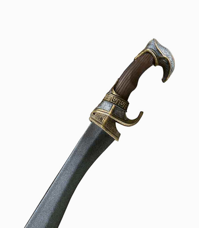 The hilt, made from resilient polyurethane foam, offers exceptional detail and durability. Its brass and steel-toned guard and pommel feature elegant Roman-style scrollwork, with curved arms designed to protect the wielder’s hand. The wood-like ergonomic grip provides both comfort and authenticity, completing the weapon’s realistic design.