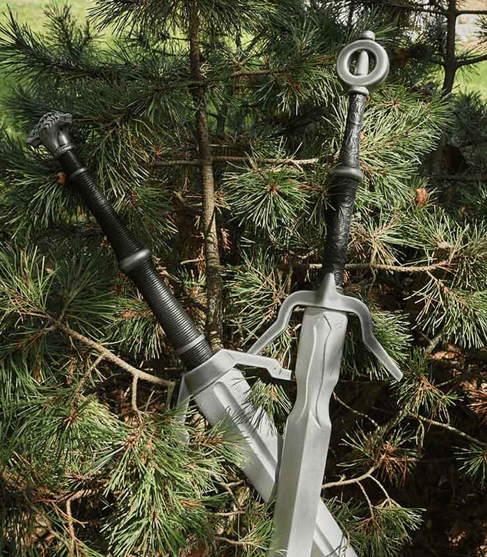 The double-edged blade boasts a well-defined fuller that extends halfway down its length, mirroring the iconic design seen in the game. From there, the sword transitions into a striking crossguard with angled, lightning-shaped arms pointed toward the blade—instantly recognizable to fans of the franchise. The black handle features a realistic wrapped texture for a secure grip, designed for comfortable two-handed use during dynamic movement or combat. A silver ring at the center adds visual contrast, while the dark silver pommel completes the weapon with a dramatic double-wolf motif—two snarling wolf heads facing opposite directions, symbolizing Geralt’s storied lineage and legendary skill.