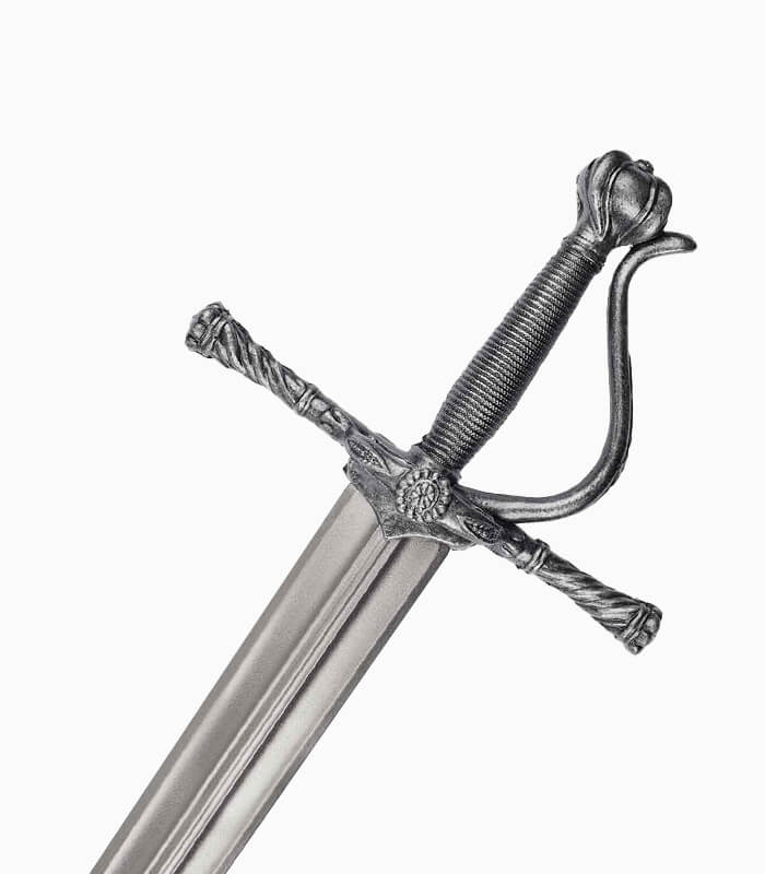 The steely-grey fluted pommel, with its spiral ridges, complements the silvery faux wire-wrapped handle for a comfortable and secure grip. The protective D-guard curves elegantly toward the pommel, adding both style and hand protection. The cruciform crossguard features a twisted design with lobed caps and silver band accents, while the finger ring guards display leaf patterns and studded details that highlight Mytholon’s exceptional craftsmanship.