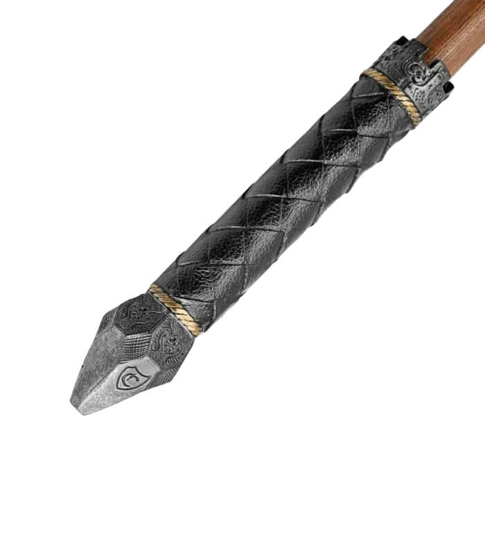The weapon features a long, straight haft topped with a striking spiked head designed to capture attention. The bottom of the haft sports a black grip with a woven, leather-like texture for comfort and control during intense moments. Steel-colored accents at each end of the grip enhance its visual appeal, with the accent at the bottom forming an impressive spike. Intricate detailing adorns the diamond-shaped spike, while a crown-shaped accent on the opposite side adds an extra touch of elegance.