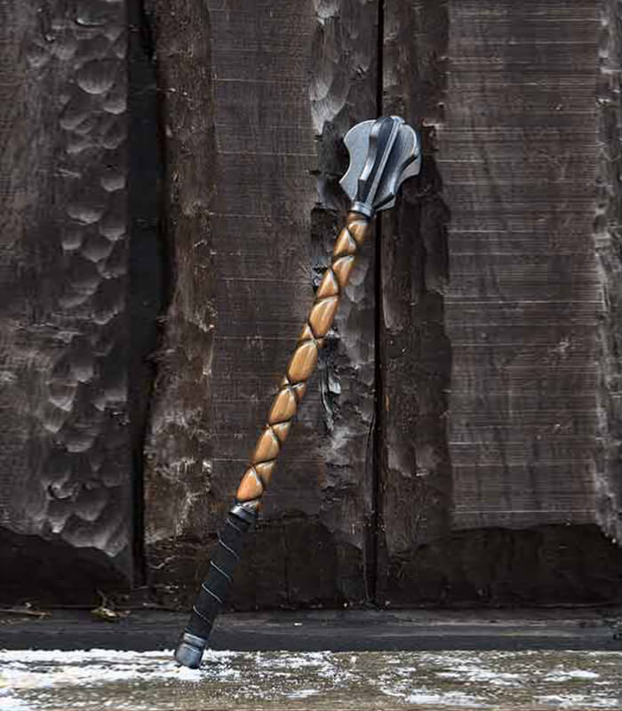 Each Skull Crusher Mace is a work of art, meticulously sculpted and hand-painted to showcase rich, intricate details. The striking head features five serrated flanges, designed for dramatic impact and intimidation. This eye-catching head rests atop a beautifully crafted spiral haft that mimics a wood finish, adorned with deep grooves for enhanced grip and style. The metallic guard and decorative pommel provide the perfect finishing touches, elevating its aesthetic appeal.